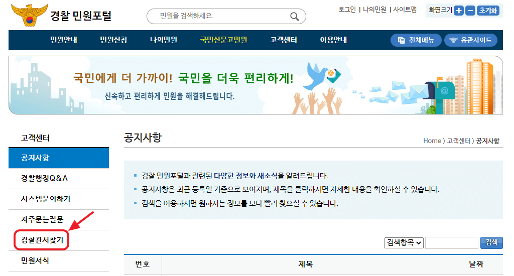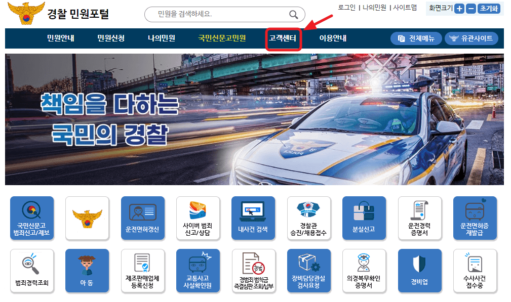 먼저 경찰민원포털에 접속해 ‘고객센터’ 메뉴로 들어가세요.