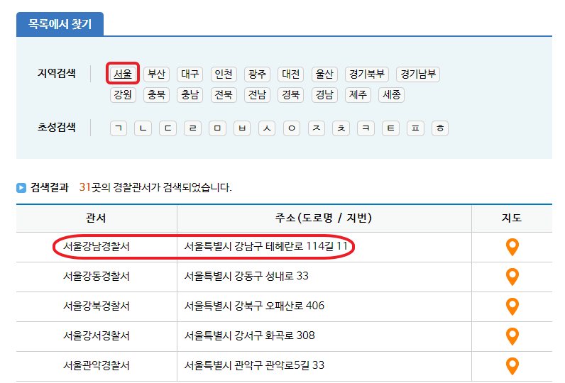 서울 강남구에 사고가 났다면, '서울'을 선택하면 서울에 있는 경찰서 목록이 가나다 순으로 뜹니다.