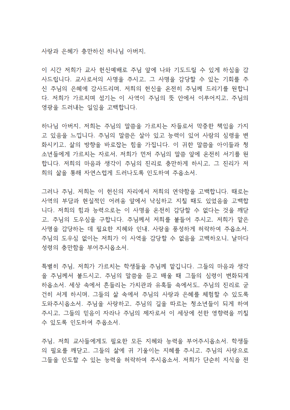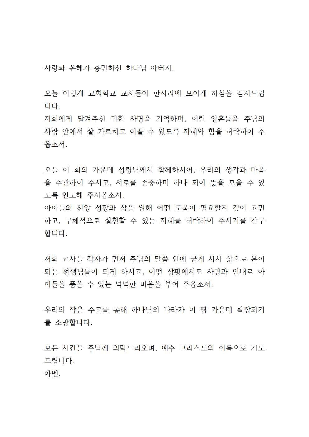 교사 회의에서 직접 적용하실 수 있도록 기도문을 첨부파일(한글문서, PDF 문서)로도 올려드릴 테니 상황에 맞게 수정하여 사용해 보세요.