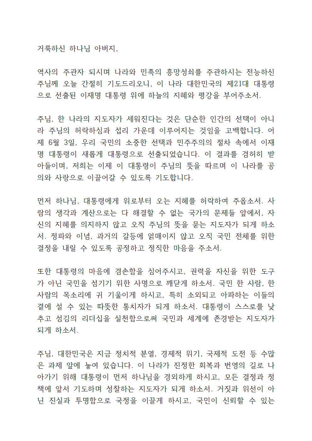 역사의 주관자 되시며 나라와 민족의 흥망성쇠를 주관하시는 전능하신 주님께 오늘 간절히 기도드리오니, 이 나라 대한민국의 제21대 대통령으로 선출된 이재명 대통령 위에 하늘의 지혜와 평강을 부어주소서.