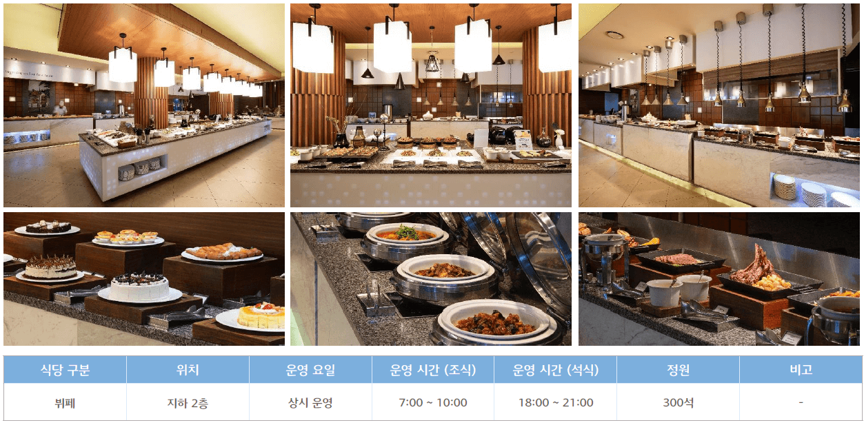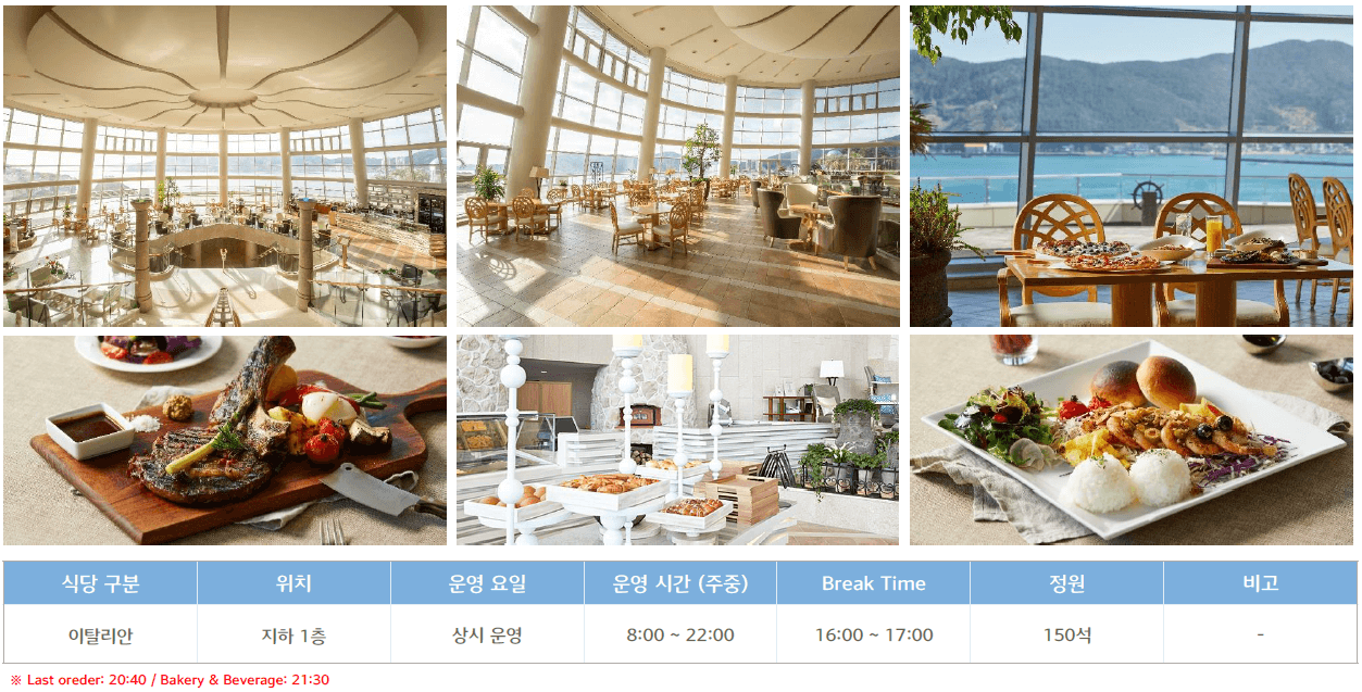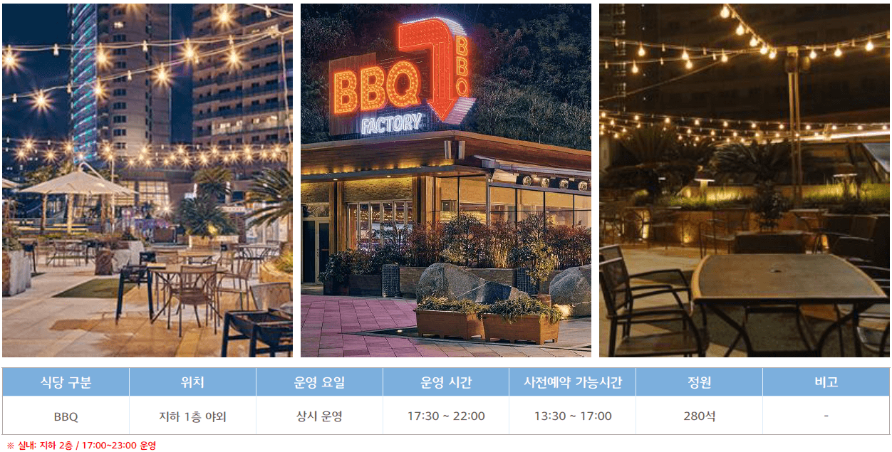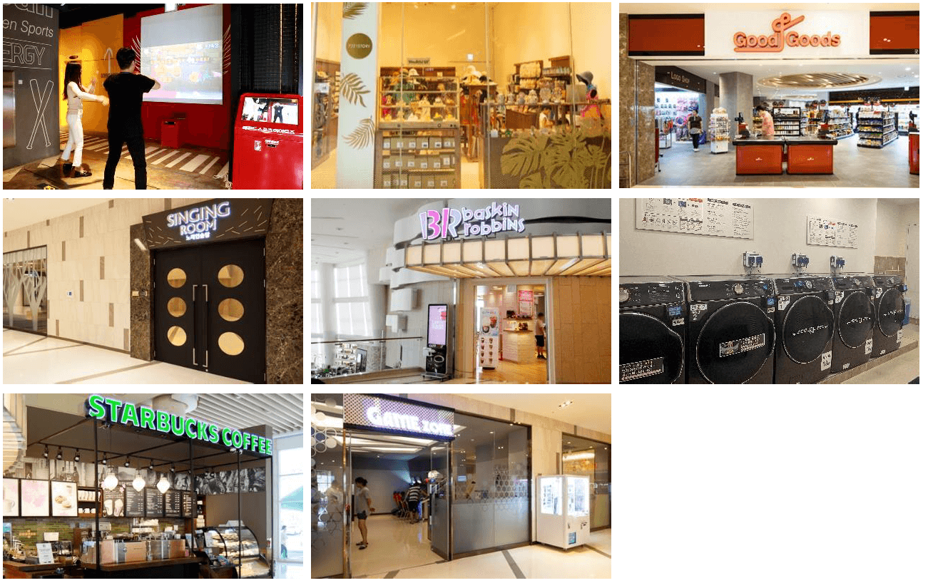 ○ 부대시설 : 식음업장 (돌체나, 셰프스키친, 몬테로쏘, BBQ Factory, 마리나 카페) / 오션어드벤처 / 마리나베이 /레전드 히어로즈, 노래연습장, 오락실 등