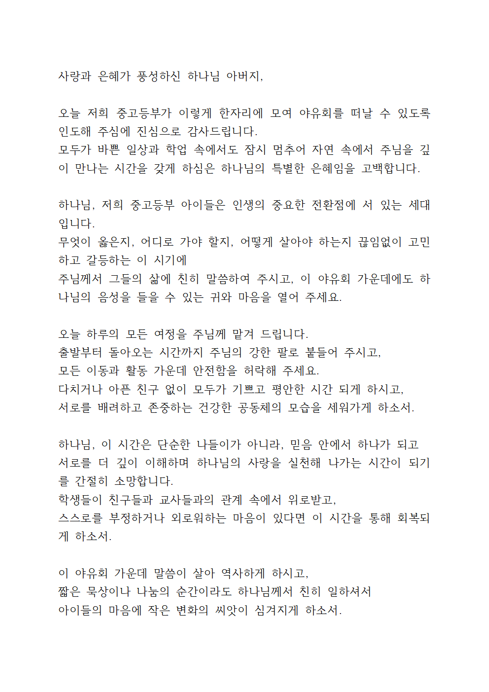 '중고등부 야유회 기도문 (청소년부)'