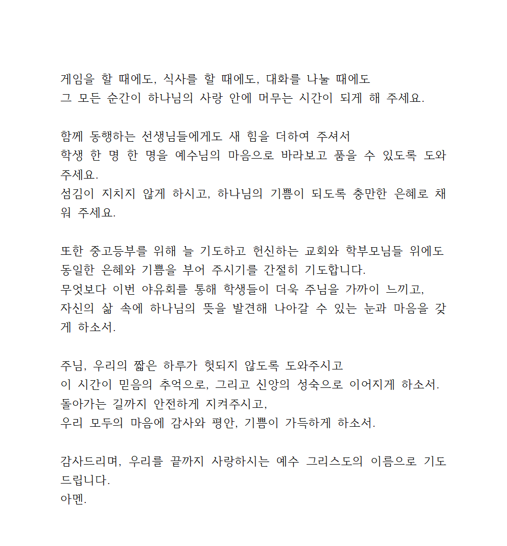 기도문을 첨부파일(한글문서, PDF 문서)로도 올려드릴 테니 중고등부 야유회 시 직접 활용해 보세요.~!!