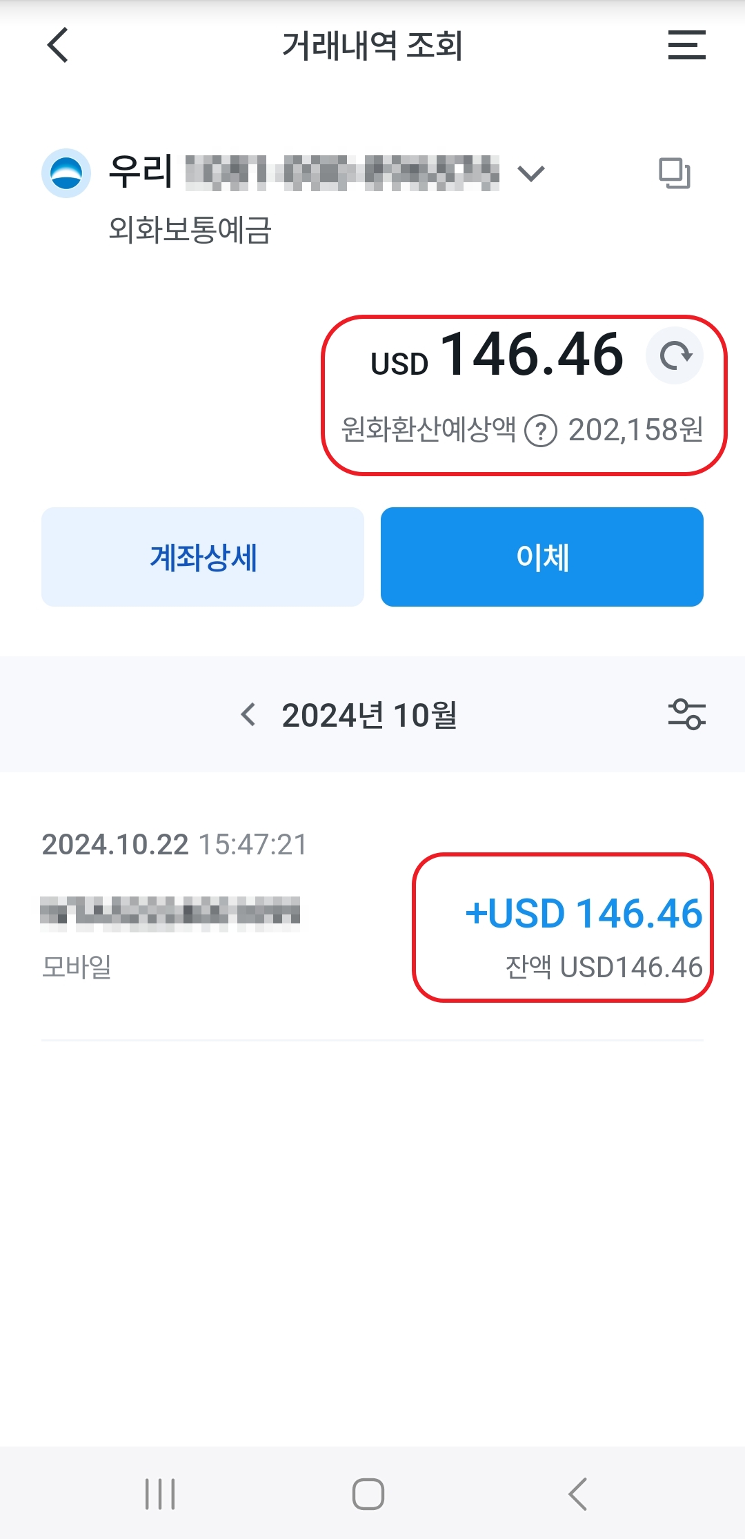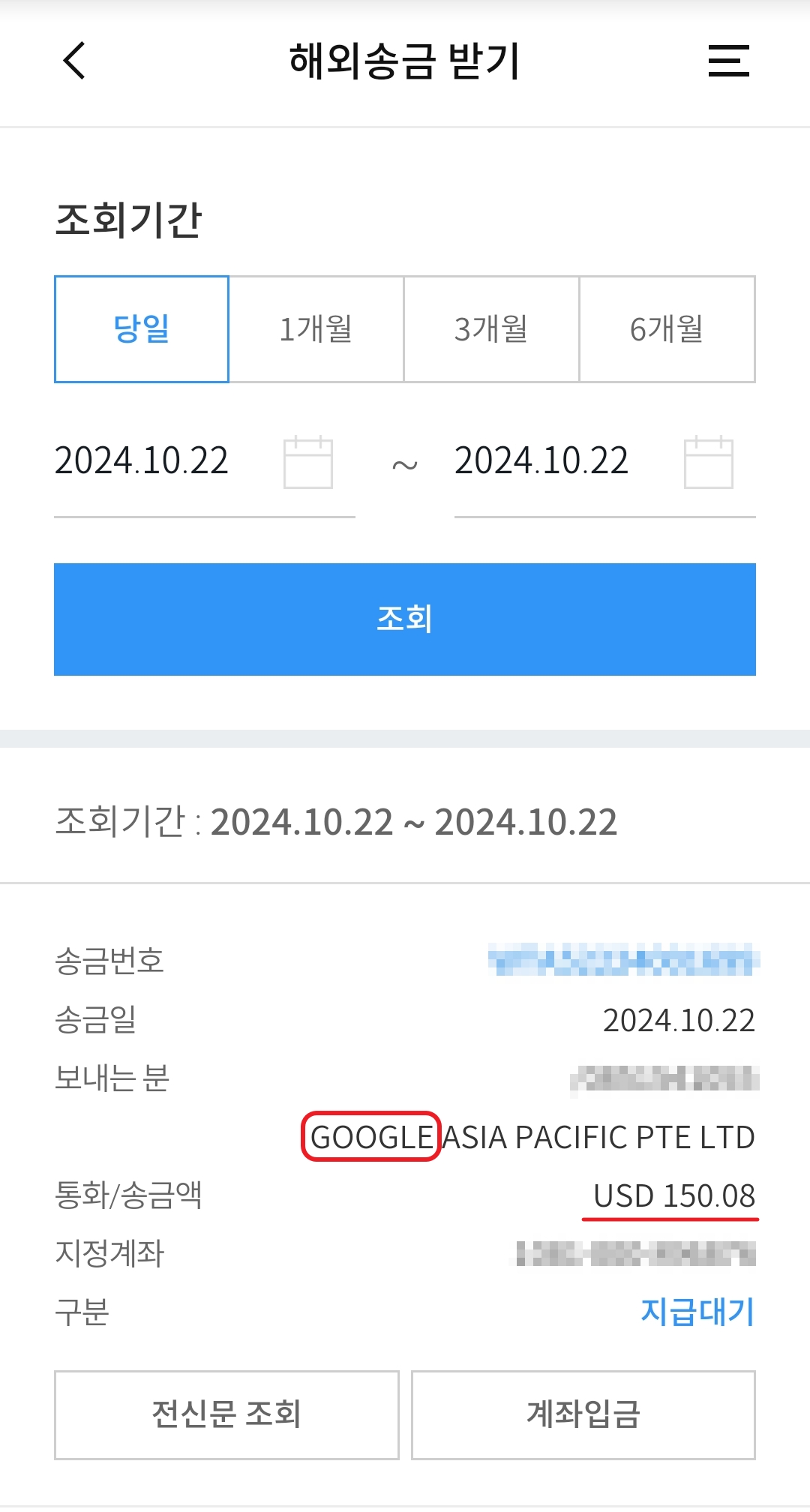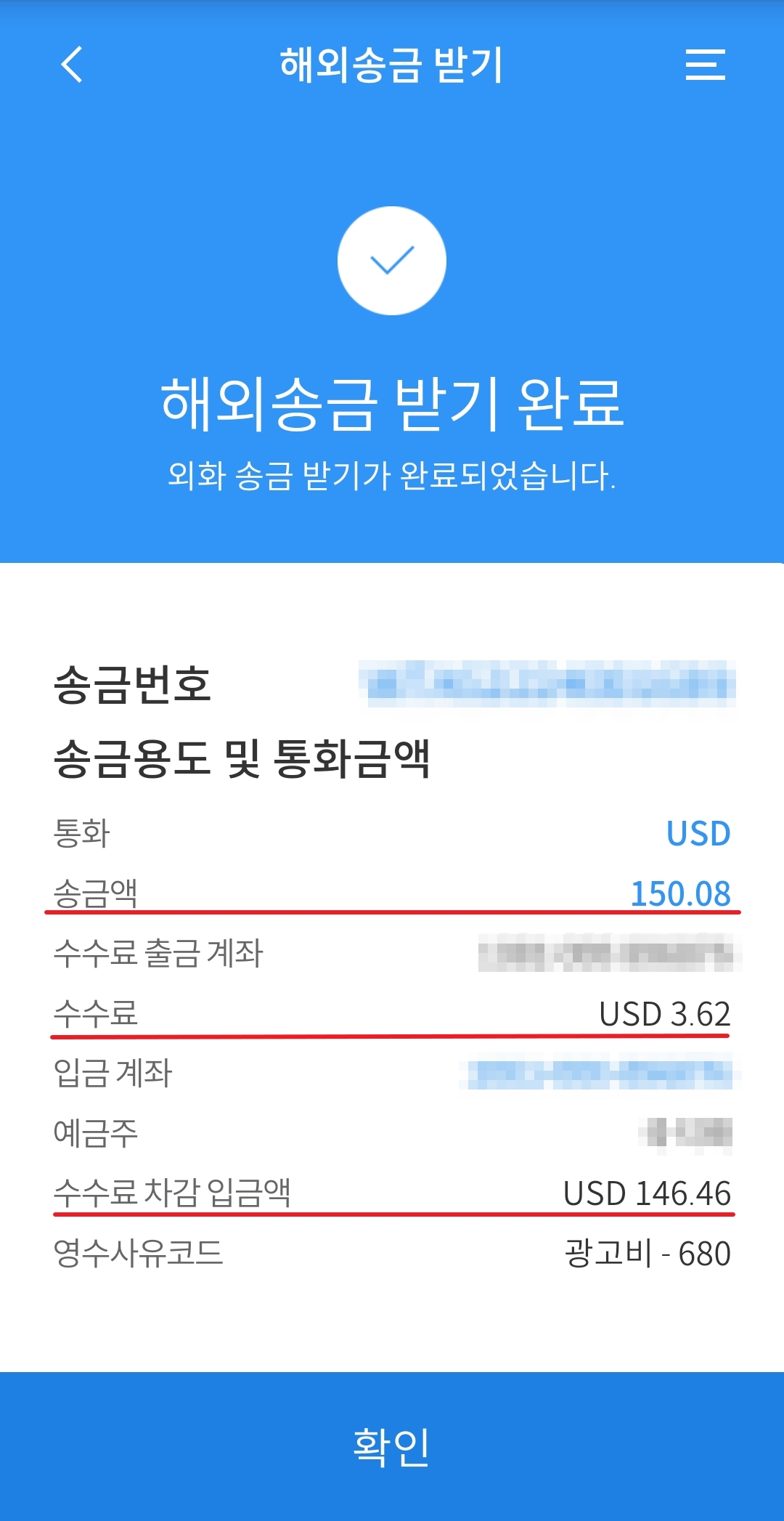해외 송금 받기를 완료한 화면입니다.