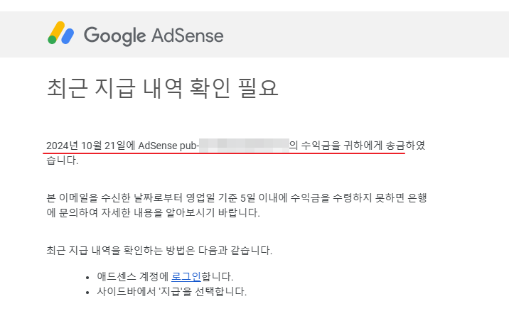 이 수익금은 은행마다 조금씩 차이가 있긴 하지만 매달 21~23일 경에 구글애드센스에 등록해 둔 은행 계좌로 입금 됩니다.