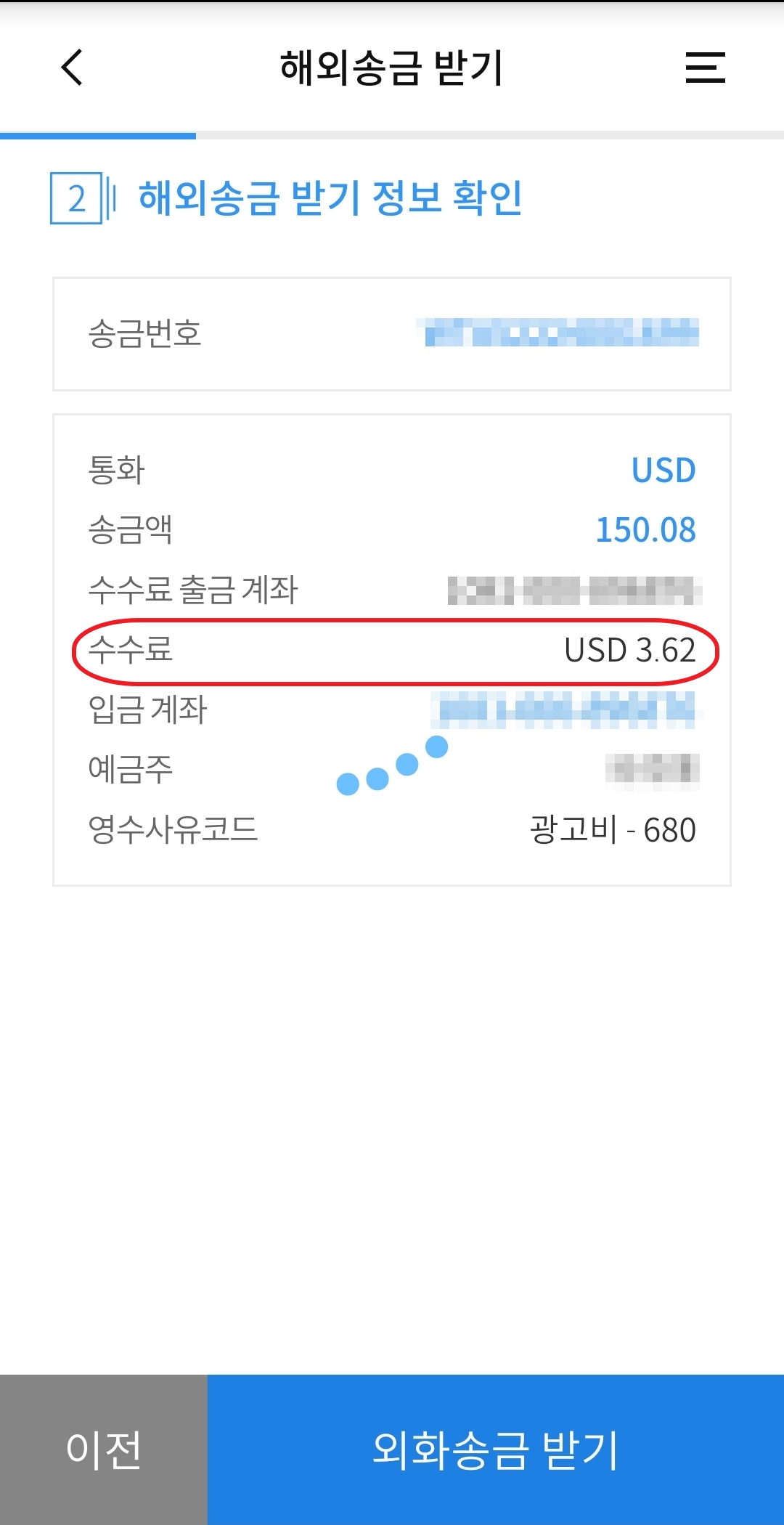 4. 해외송금 받기 정보 및 수수료 확인