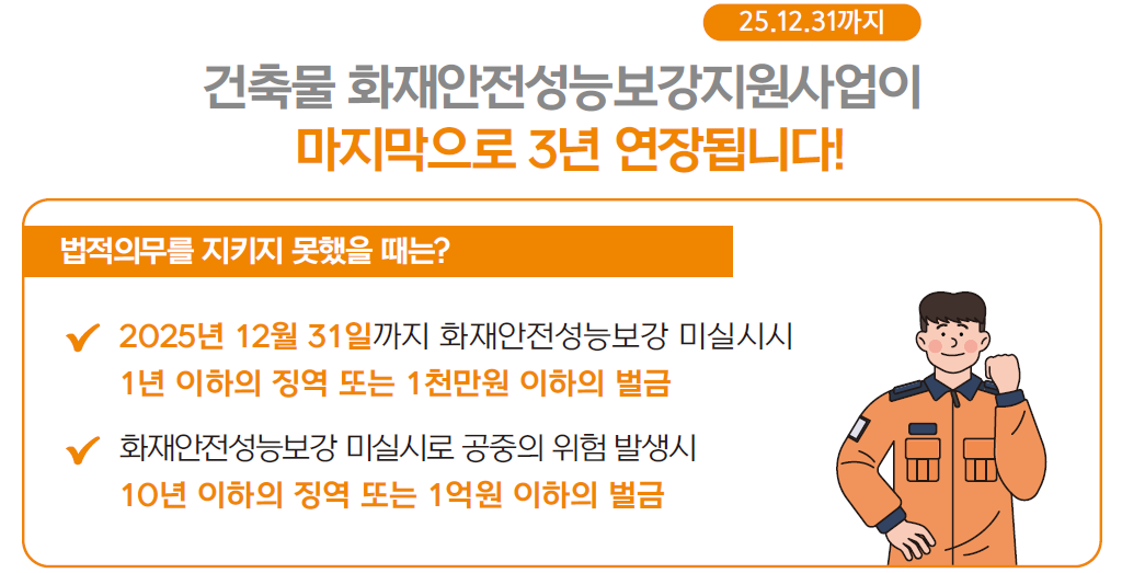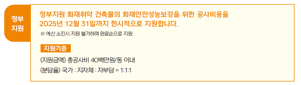 건축물 화재안전성능보강지원사업은 2025년 12월 31일까지 한시적으로 지원합니다.