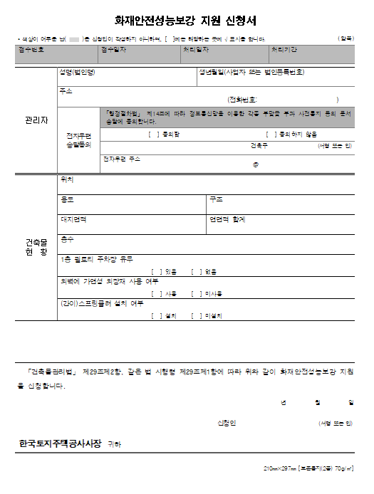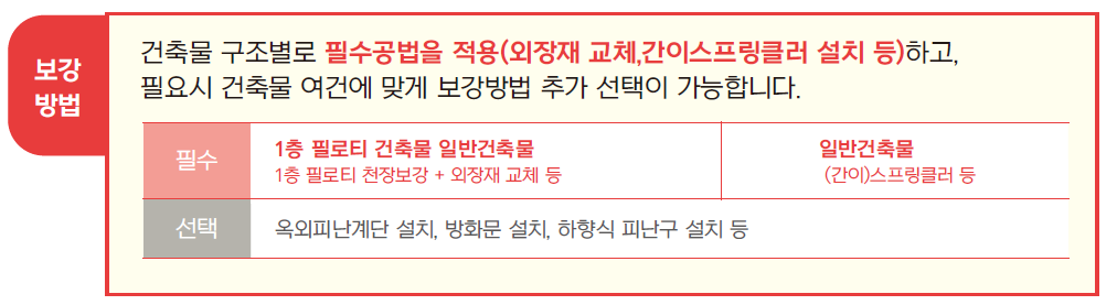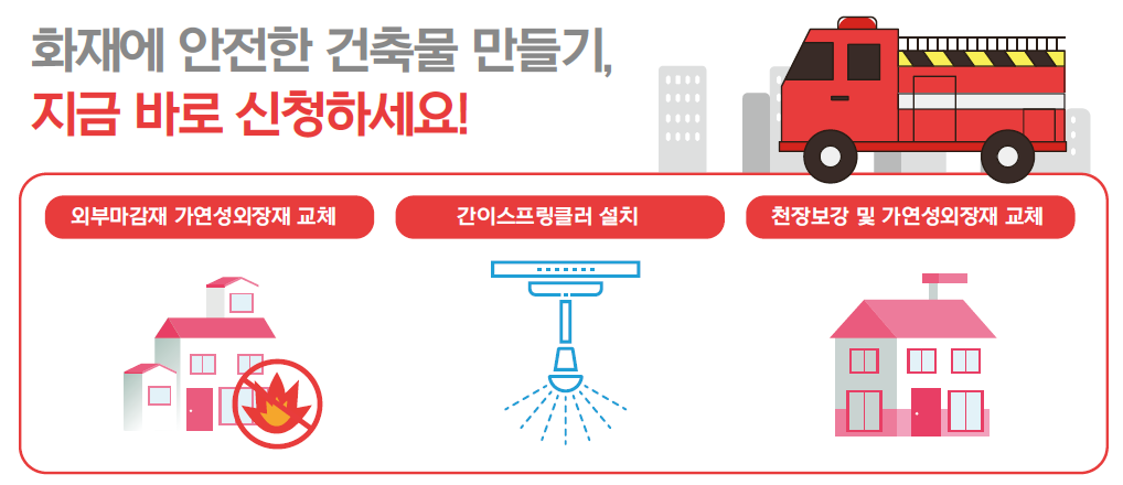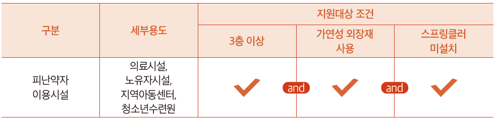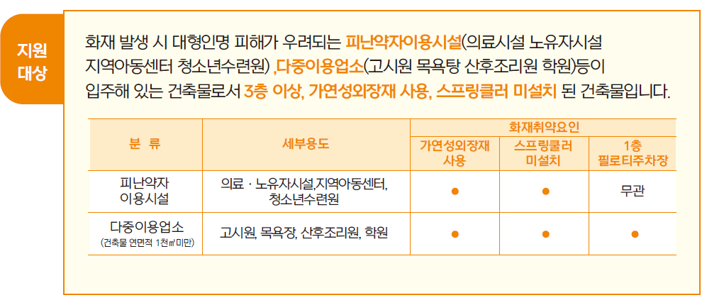 - 피난약자이용시설 및 일부 다중이용업소 등 화재취약건축물의 화재안전성능보강을 위한 외장재 교체 등 공사비용 지원