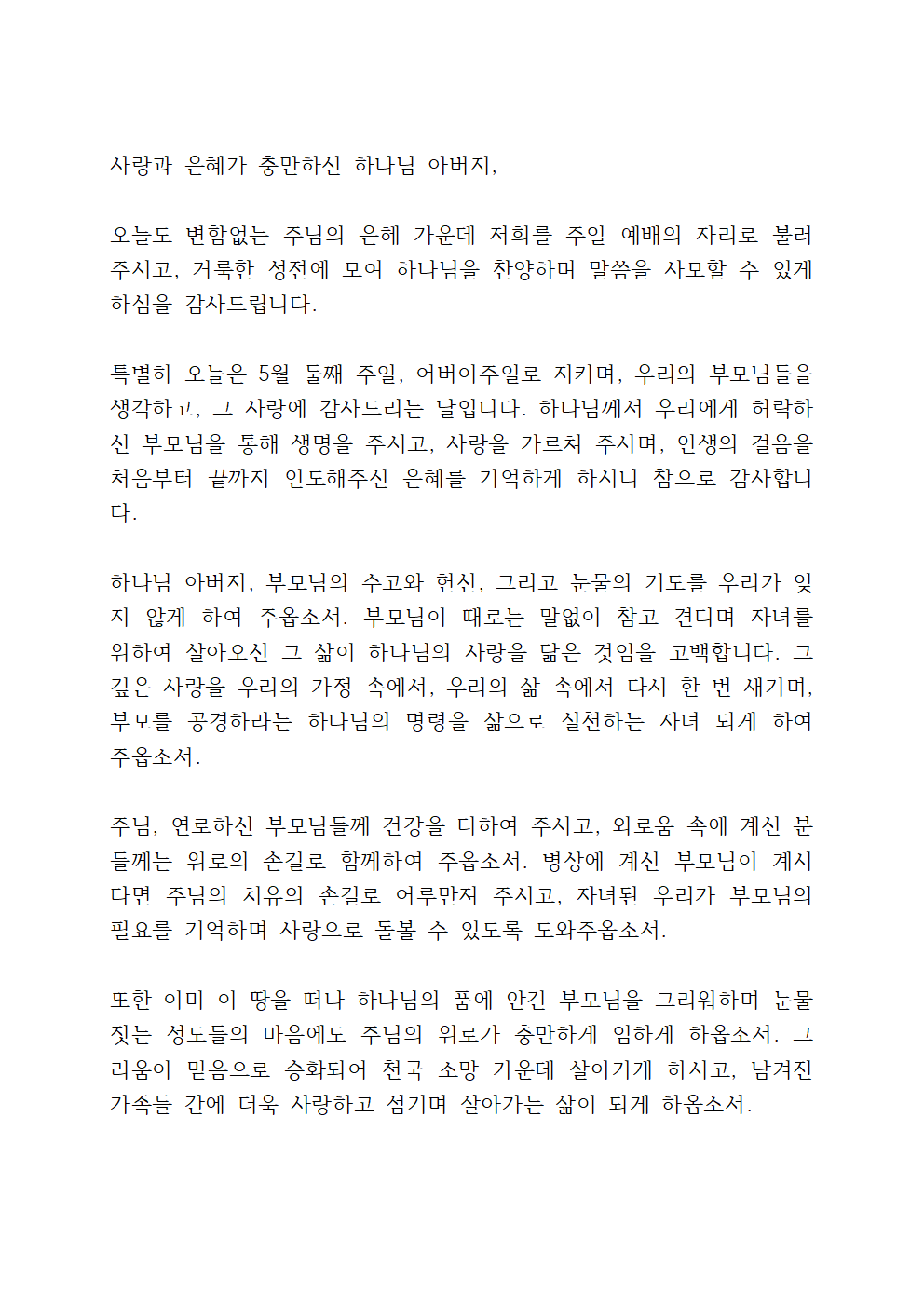 5월의 둘째 주일은 어버이 주일이기 때문에 부모님 및 교회 어르신들을 위한 기도를 담고 있으면 좋습니다.