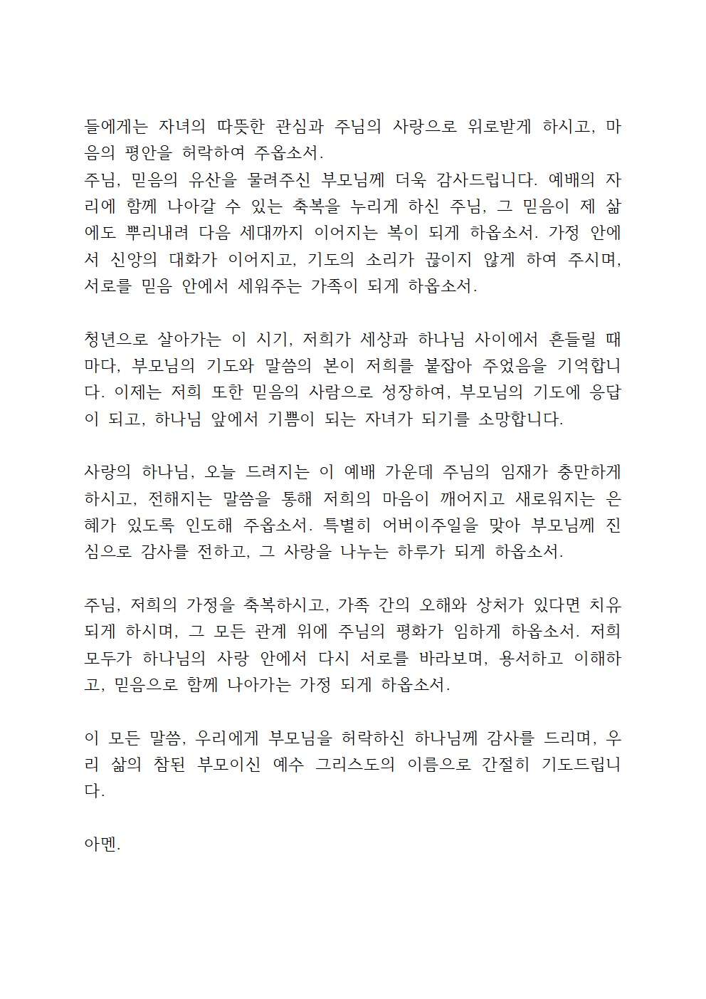 주님, 이 땅의 모든 어버이들에게 건강과 평안을 더하여 주시고, 외로움과 고단함 속에서 위로와 소망을 얻게 하여 주옵소서. 젊은 날 자녀를 위해 흘린 땀과 눈물을 기억하시고, 이제는 위로와 쉼의 시간을 허락하여 주시며, 무엇보다 주 안에서 참 평강을 누리는 삶이 되게 하소서.