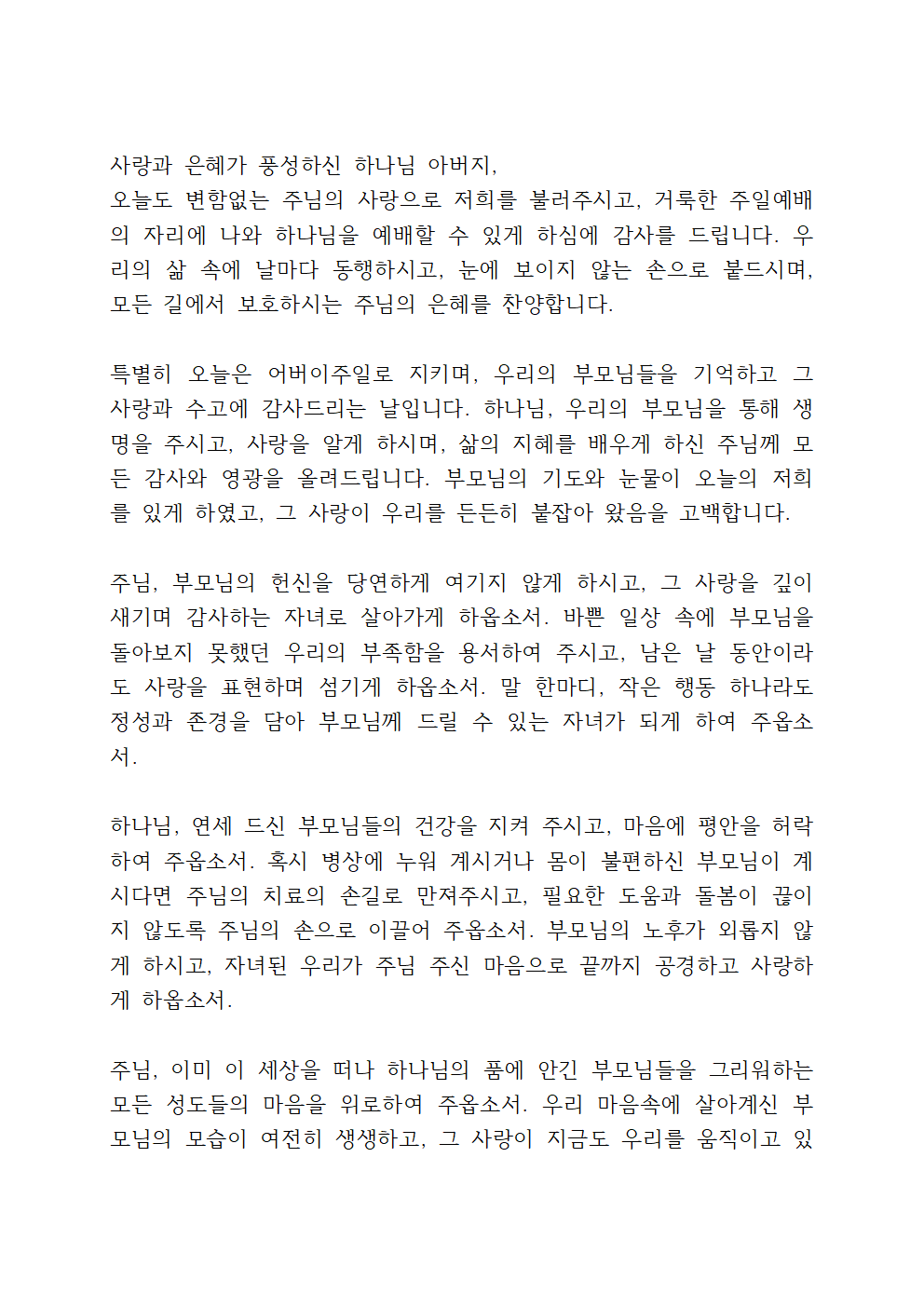 오늘은 특별히 어버이주일로 지키며, 저희에게 생명 주시고 길러주신 부모님들의 사랑과 수고를 기억하며 감사하는 마음으로 이 자리에 섰습니다. 먼저 저희의 부모님들을 이 땅에 허락하신 주님의 섭리를 찬양합니다. 부모님의 희생과 헌신을 통해 오늘의 저희가 존재함을 고백하며, 그 사랑 안에 담긴 주님의 사랑을 깊이 깨닫게 하소서.