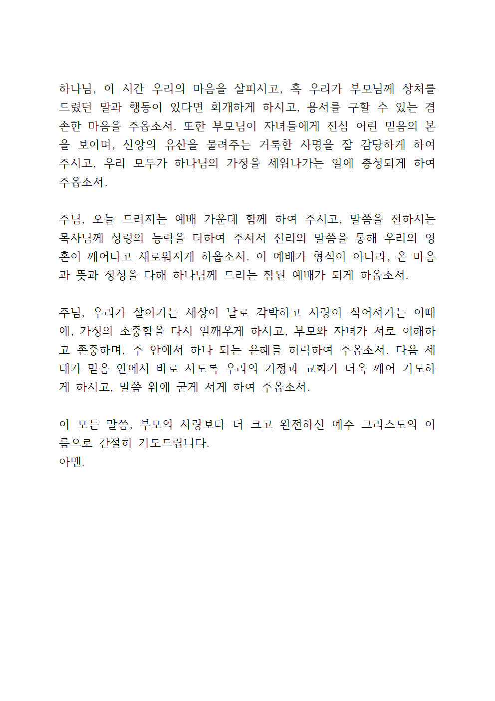 믿음의 유산을 자녀들에게 물려주신 부모님들의 손길을 복 주시고, 아직 믿지 않는 어버이들께는 구원의 은혜가 임하게 하셔서, 가정마다 주님의 복음이 충만히 임하는 은혜의 가정되게 하옵소서. 저희 자녀 된 자들도 부모를 공경하는 마음을 잊지 않게 하시고, 말과 행동으로 그 사랑에 보답하며 살게 하소서.