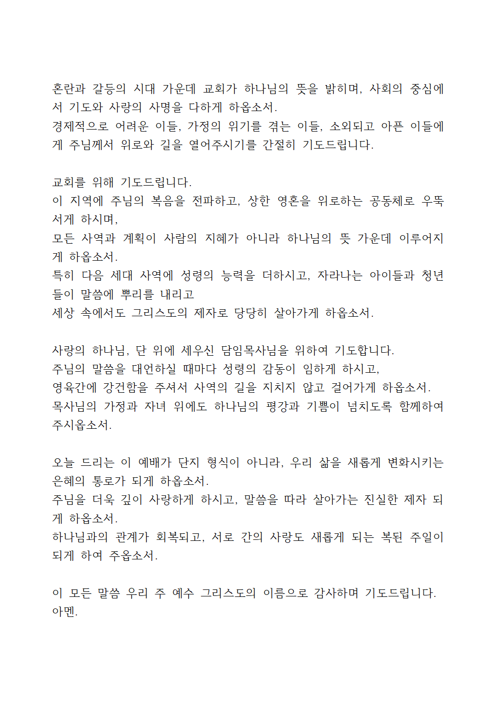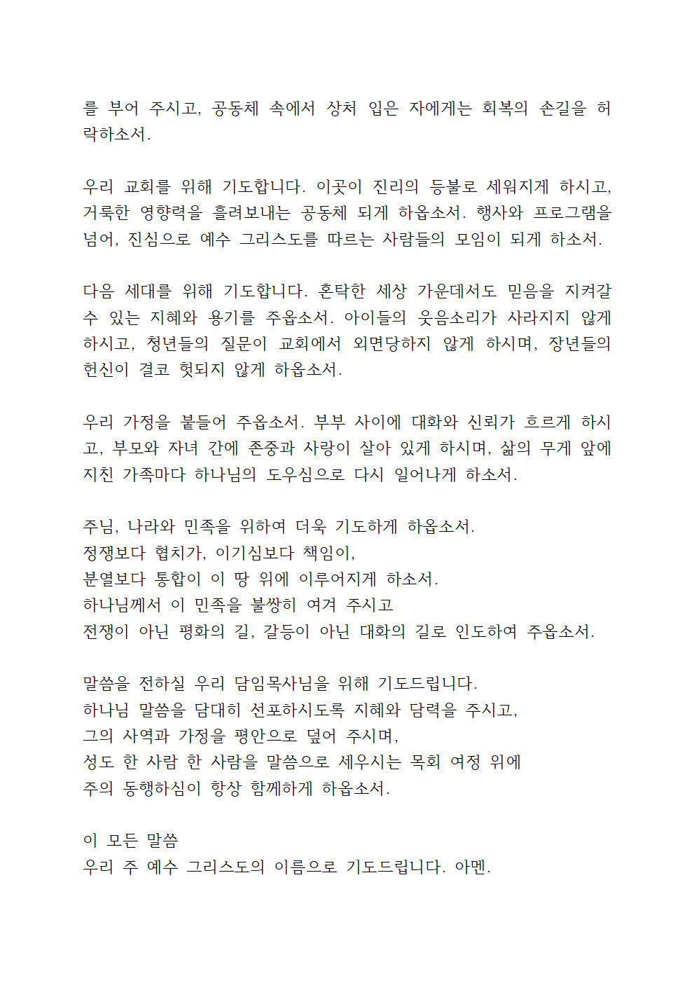 주님, 나라와 민족을 위하여 더욱 기도하게 하옵소서. 정쟁보다 협치가, 이기심보다 책임이, 분열보다 통합이 이 땅 위에 이루어지게 하소서. 하나님께서 이 민족을 불쌍히 여겨 주시고 전쟁이 아닌 평화의 길, 갈등이 아닌 대화의 길로 인도하여 주옵소서.