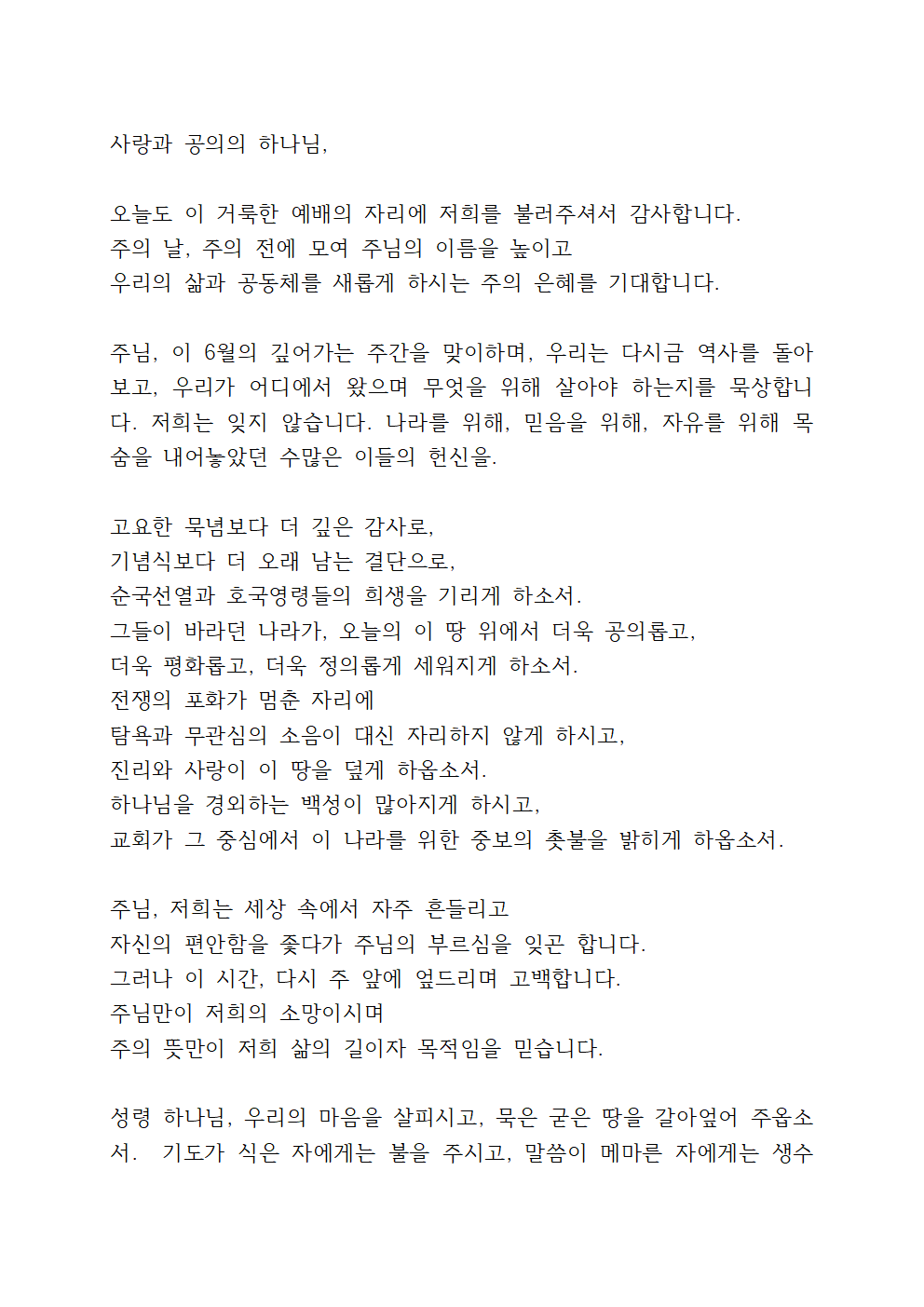 주님, 이 6월의 깊어가는 주간을 맞이하며, 우리는 다시금 역사를 돌아보고, 우리가 어디에서 왔으며 무엇을 위해 살아야 하는지를 묵상합니다. 저희는 잊지 않습니다. 나라를 위해, 믿음을 위해, 자유를 위해 목숨을 내어놓았던 수많은 이들의 헌신을.