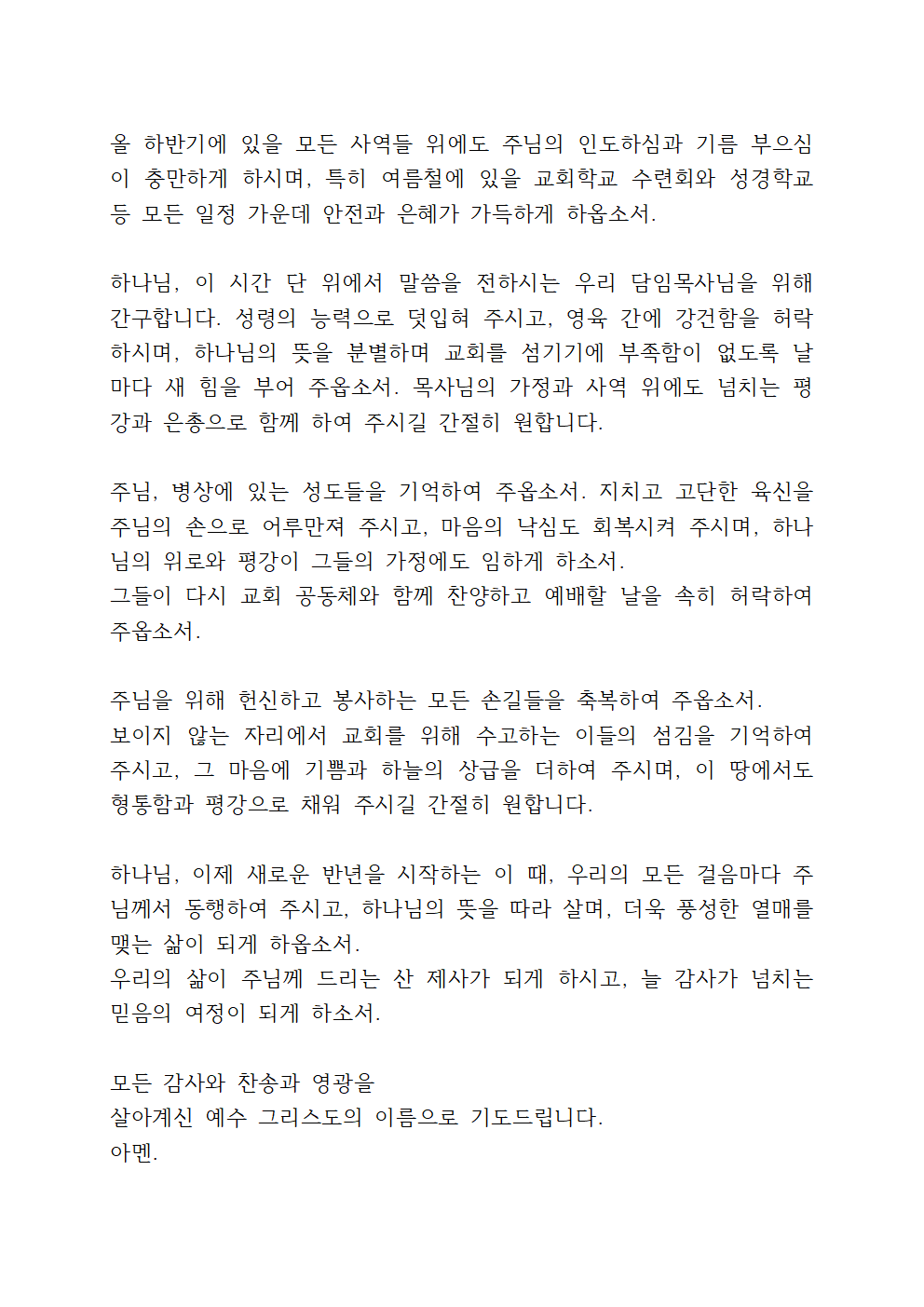 하나님, 이제 새로운 반년을 시작하는 이 때, 우리의 모든 걸음마다 주님께서 동행하여 주시고, 하나님의 뜻을 따라 살며, 더욱 풍성한 열매를 맺는 삶이 되게 하옵소서. 우리의 삶이 주님께 드리는 산 제사가 되게 하시고, 늘 감사가 넘치는 믿음의 여정이 되게 하소서.