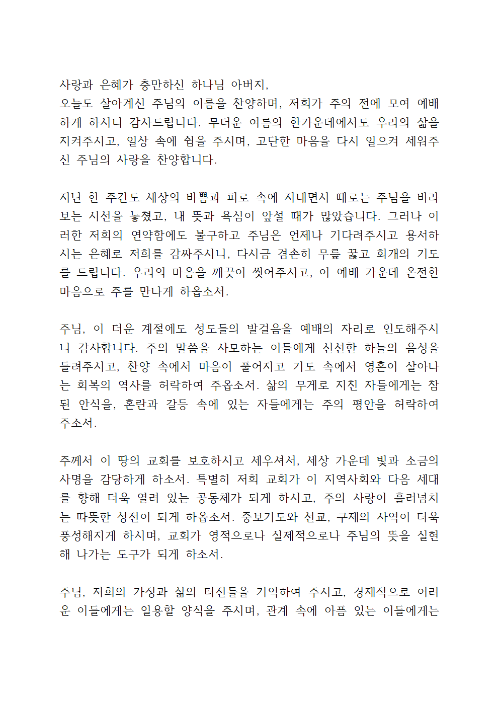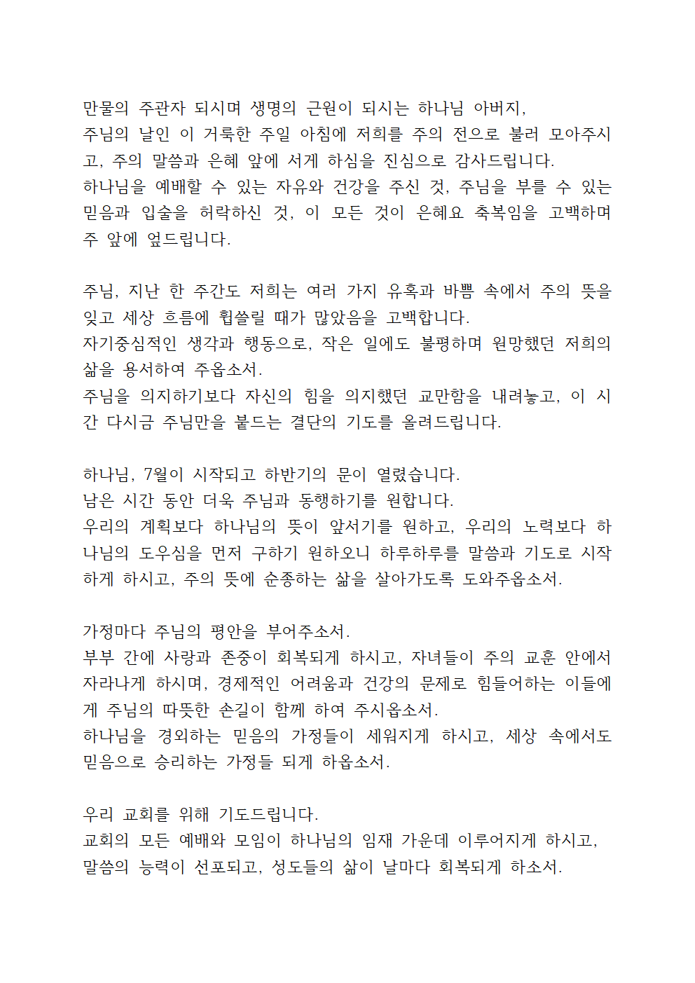 7월 둘째 주 수요예배 기도문