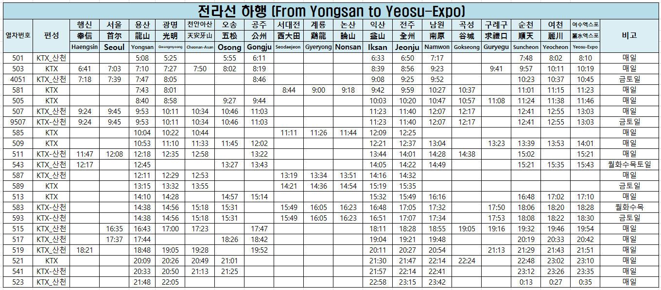 ● KTX 전라선 시간표