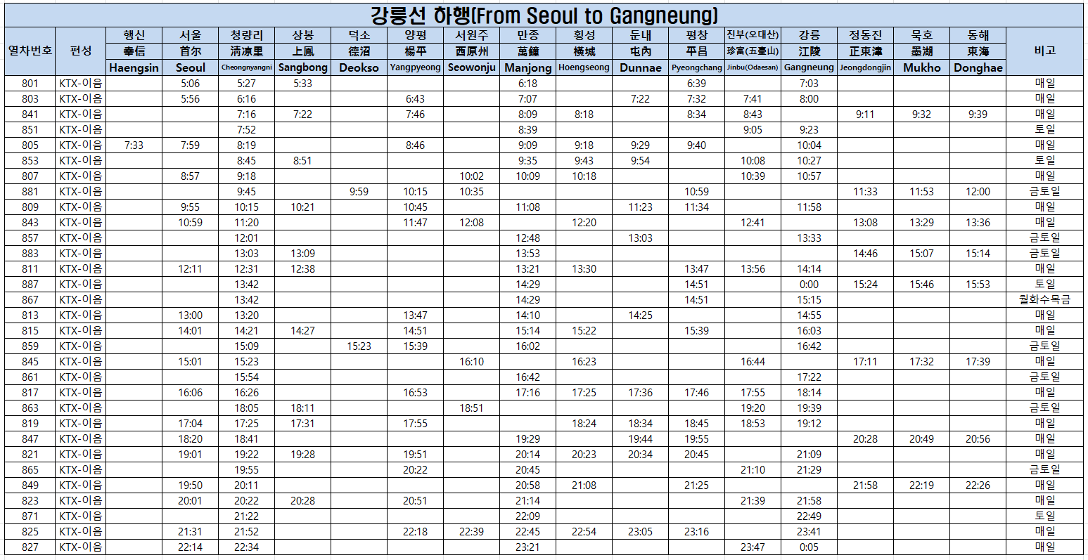 ● KTX 강릉선 시간표